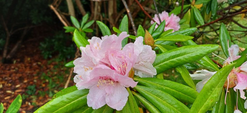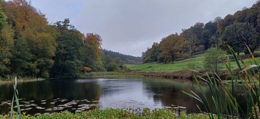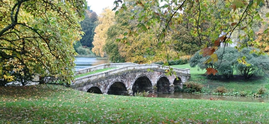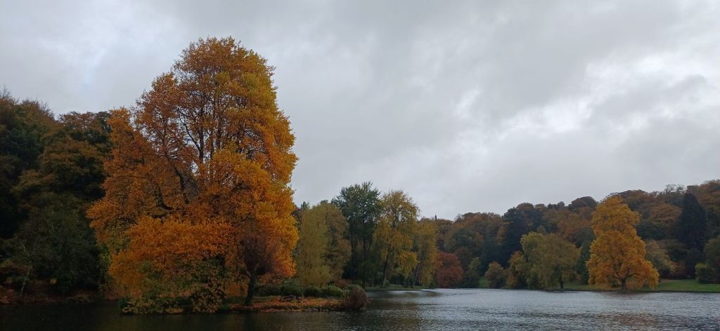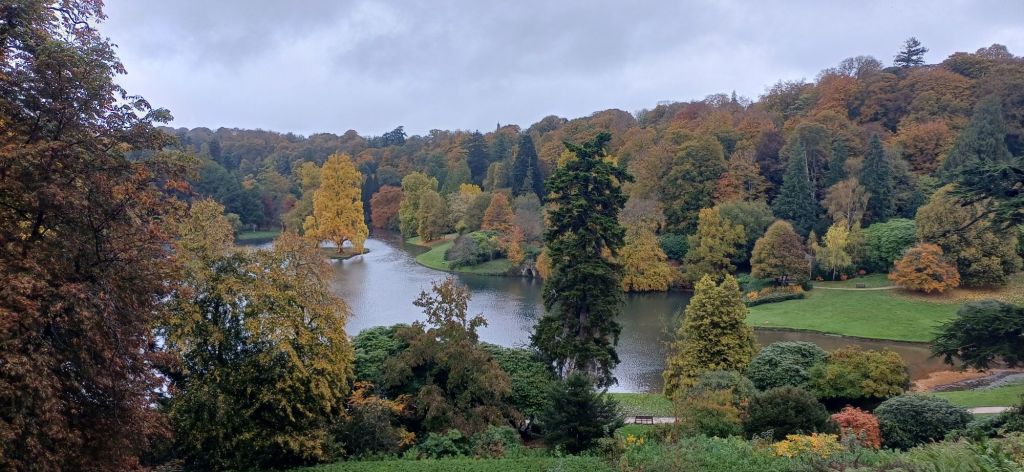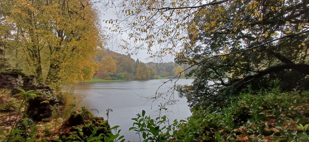 Off we went, along the first path surrounded by blips of autumn colour, then arriving at an elevated viewpoint overlooking part of the lake and its Palladian bridge, perfectly framed by trees. From there, we descended in a short gentle zigzag down a tree-covered hillside, the canopy dripping from all the recent rain. At least one rhododendron was in flower, much to the delight of the busy bees. The wet, glossy leaves looked at their very best, and the smell of damp woodland hung in the air—a reminder not to let rain become a barrier. It wasn’t a warm and sunny day but it was another kind of experience altogether. A wonderful one, at that.