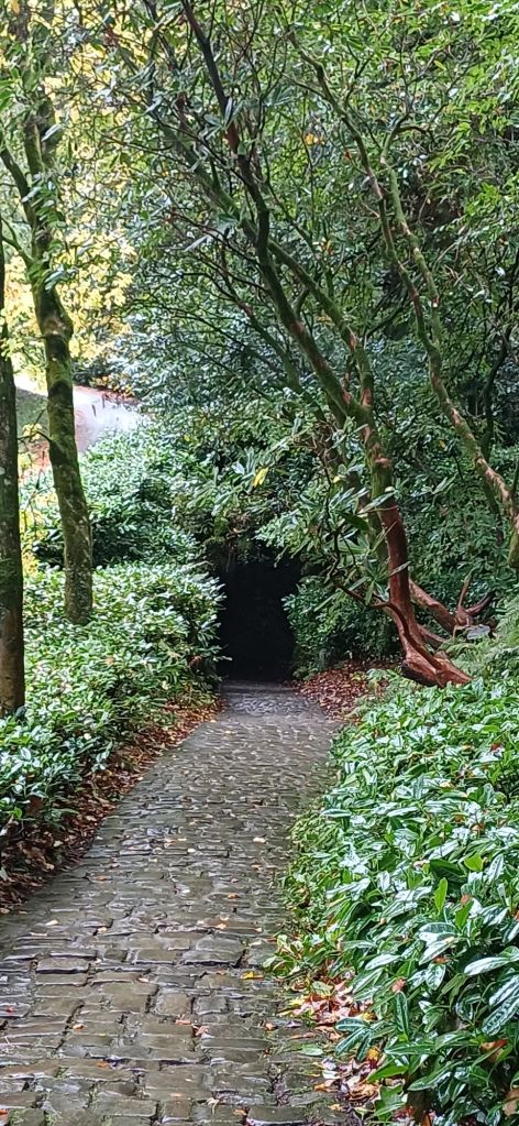 At the lake, the show truly began and right on cue, the heavens opened. Umbrellas deployed, we walked through the downpour, which only heightened the dramatic scenes of autumn we were enjoying so much. Theatrical undulations up and down, intertwined with open light areas and deep shaded parts, monster trees, and stone-lined tunnels leading to points of interest like the mystical Grotto. Even the soundscape changed as we walked through the different sections—rain on the tree canopy and lake, trickling water, and moments of muffled quiet or echoing as we passed through tunnels. A metaphorical stream of sensory tonic—stirring, immersive, unforgettable.